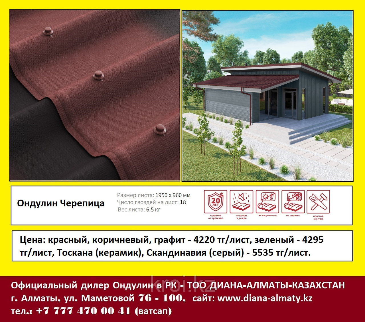 Черепица Ондулин – новое поколение волнистых листов Ондулин, толще обычных листов Смарт, с другой формой волны и сроком гарантии от протечек 20 лет (против 15 лет для листов Смарт). Внешне она очень похожа на натуральную черепицу и подходит для любых типов крыш. Выпускается в стандартном (1,95 на 0,96 м) и в более узком размере DIY (1,95 на 0,82 м).